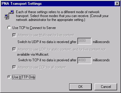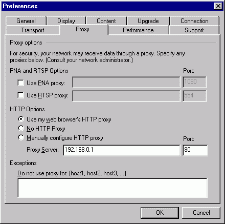 MailGate Support Issues Q. How do I set up MailGate to proxy RealPlayer 8 A. Realplayer 8 can be set up to work via the HTTP proxy. Warning - Enabling Real Player to run in the System tray could initiate unwanted proxy connections. With a dial-up connection this could lead to some large phone bills. RealPlayer setup In the RealPlayer application on the client machine, click View | Preferences and select the Connection tab. Set the normal and maximum bandwidth to suit your LAN. ![]() ...next, select the proxy tab, and select either "Use my Web browser's HTTP proxy" or select "Manually configure HTTP proxy" and specify the IP address of the MailGate machine and the HTTP port (usually 80) as shown in the fields below: ![]() ...next, select the Transport tab, select "Use specified transports"... ![]() ...click the RTSP Settings button, and configure as below: ![]() ...click OK, then click the PNA Settings button, and configure as below: ![]() |