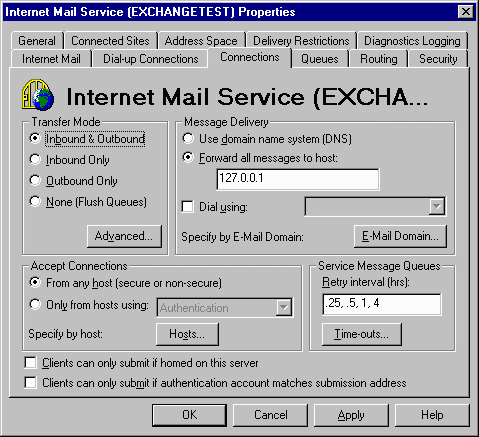 MailGate Support Issues Q. How do I set up MailGate with MS Exchange 5.5? A. You can use the mail handling functions of MailGate with Microsoft Exchange. In addition your users get the advantage of being able to use MailGate's integrated proxy gateway and all of the Extension Modules. If you plan to use MailGate to proxy Web requests, in MailGate click on Gateway | Setup | Web tab, and make sure the HTTP proxy is enabled. Also, check out the Browser Configuration section. Make sure that any other proxy services on the machine are disabled. You can set MailGate to collect from your ISP POP account(s) as normal and send all of the mail on to MS Exchange. Also, Exchange can send mail to MailGate instead of the ISP. This way all of your connections can be handled via MailGate's highly configurable schedules. There are two ways in which you can achieve this: The first, and more simple way, is to have MailGate and Exchange on seperate machines. In MailGate: 1) Set up POP collection(s) and schedule(s) as desired. 2) Click on gateway, setup, and select the LAN Forward tab, click on the ADD button. Type "*" into the Address Pattern field, and the IP address of the Exchange Server machine into the SMTP Server field, and the port number as 25. This will make MailGate forward all incoming mail to MS Exchange. In Exchange: 1) Click on the Connections icon, double-click on the mail service you use, and select the Connections tab. In the "Message delivery" area, select "Forward all messages to host:" and set it to the IP address of the MailGate machine. Make sure that the "Dial using" box is unchecked. Exchange will now send the outgoing mail to MailGate, which will in turn send it on to the Internet during the next connection. The second, and more complicated way, is to have MailGate and Exchange on the same machine. The complication comes about because of the SMTP port, number 25. SMTP is the protocol used to send mail, and both MailGate and Exchange have SMTP services which use port 25. Only one service may make use of a port at any time. To get around this problem, we get Exchange SMTP services to listen on another port for incoming SMTP mail. You can use any number as long as it's not a port used for another protocol, but you're generally safe by repeating the port number twice (ie. 2525). In WinNT: 1) Go to "C:\Winnt\System32\Drivers\Etc" and open the "Services" file. 2) Find the line for the SMTP service... smtp 25/tcp mail 3) Change it to point to an unused port (ie. 2525)... smtp 2525/tcp mail In MailGate: 1) Set up POP collection(s) and schedule(s) as desired. 2) Click on gateway, setup, and select the LAN Forward tab, click on the ADD button. Type "*" into the Address Pattern field, and "127.0.0.1" into the SMTP Server field, and the port number as 2525 (or whatever you wish the port to be). This will make MailGate forward all incoming mail to MS Exchange. In Exchange: 1) Click on the Connections icon, double-click on the mail service you use, and select the Connections tab. In the "Message delivery" area, select "Forward all messages to host:" and set it to "127.0.0.1". Make sure that the "Dial using" box is unchecked. You will then need to restart the server. ![]() |