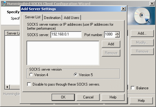 - Next you need to specify the Socks server, click on the Add button to open the settings window. Type the IP address of the machine MailGate is on into the "Socks server" field, then click the Add button. Click OK to accept this, then click Next.